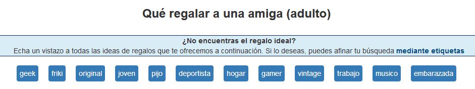 Además nos da la posibilidad de poder filtrar la búsqueda mediante etiquetas, por ejemplo si ponemos para regalar a una mujer adulta que es nuestra amiga, nos salen hasta 12 etiquetas donde nos será más fácil localizar el regalo que vamos buscando, por ejemplo si nuestra amiga está embarazada deberíamos marcar la última opción.